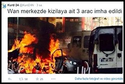Kızılay’a ait kan toplama araçlarını ateşe veren teröristler, vandallıklarını zafer olarak Twitter’dan paylaştı. Kurd24 isimli hesaptan araçların yanarken çekilmiş fotoğrafı “Van merkezde Kızılay’a ait üç araç imha edildi” ifadeleri ile paylaşıldı.